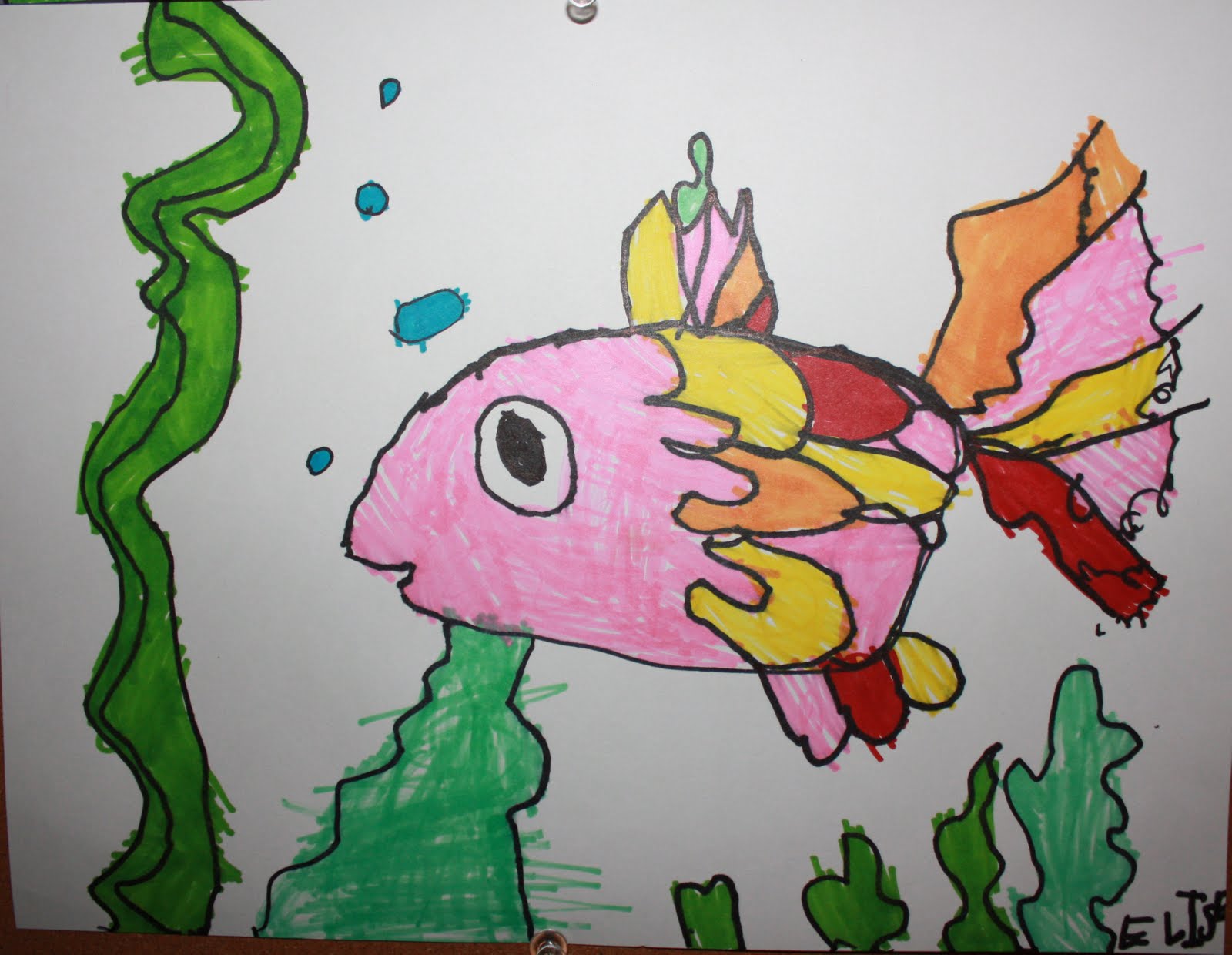 Elise has loved to do art projects since she could hold a crayon and so when I heard about an adorable Art Camp they offer in town for the summer, I knew it was for her. Just an hour and a half each morning for a week...she was thrilled at the idea, and had such a great time. I must say I was pretty blown away each day by the work she brought home. So, here it is, her first art show: